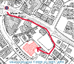 Fuss vom Meierhofplatz Den Tramgeleisen nach 80 Meter Richtung Hauptbahnhof bis zur Tankstelle auf der rechten Seite. Auf der Höhe der Tankstelle endet eine alte Steinmauer, welche schräg von der Hauptstrasse wegführt. Am Ende der Mauer (neben der Tankstelle) ist ein Schild angebracht und es beginnt ein Fussweg, welcher nach 50 Metern direkt zum Reformierten Kirchgemeindehaus führt. |